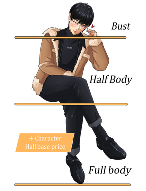 | Stylized render:(Detailed art style with or little to none lineart) - Bust = $40 - Half body = $50 - Full body = $60 |